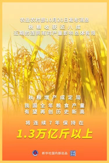 據農業農村部10月20日消息,目前秋糧收獲近八成,近期的連陰雨對產量影響總體有限,秋糧增產已成定局。全年糧食產量有望再創歷史新高,將連續7年保持在1.3萬億斤以上。(記者于文靜、胡璐,海報設計楊軼群)