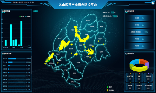 雅安名山位于成都平原西南邊緣,擁有茶園面積35萬畝左右,揚子江心水,蒙山頂上茶,千百年來被廣為傳頌。為進一步提質增效,打造全國高品質茶葉基地,打響蒙頂山茶品牌,雅安名山區目前已在核心區域布設天敵友好型茶園殺蟲燈900余臺,逐步完善茶園綠色防控體系的建設,通過特制的LED誘蟲光源,針對茶園主要害蟲精準防控,大大減少茶園化學農藥的施用次數和施用量,保障茶葉品質及生態環境安全,實現綠色高質量發展。