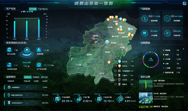 峨眉山茶始于西周,發乎于秦漢,盛名唐宋。近年來,峨眉山市國家農村產業融合發展示范園堅持以茶葉為主導產業,建設優質茶業基地,形成“園區+產業+旅游+文化”的茶產業模式。托普云農以峨眉山茶產業基地為依托,布設蟲情、苗情、墑情、災情監測智能裝備,打造茶產業數字化平臺,涵蓋茶產業一張圖、生產綜合管理、市場行情監測等內容,打通從“茶園”到“茶杯”的全茶產業鏈,帶動農戶走出一條可復制的增收之路。