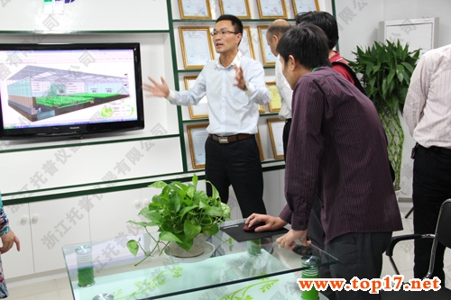 接著,各領(lǐng)導(dǎo)、專家重點(diǎn)參觀了托普儀器樣品展覽室、生產(chǎn)車間。在樣品展覽室,陳總重點(diǎn)介紹了公司農(nóng)業(yè)物聯(lián)網(wǎng)智能環(huán)境監(jiān)測(cè)與自動(dòng)控制系統(tǒng)。此系統(tǒng)主要由信息采集系統(tǒng)、無線傳輸系統(tǒng)、視頻監(jiān)控系統(tǒng)、自動(dòng)控制系統(tǒng)、軟件平臺(tái)組成,對(duì)溫室大棚進(jìn)行全面智能化操控,可以大大降低勞動(dòng)強(qiáng)度,增加作物產(chǎn)量,該系統(tǒng)廣泛用在國(guó)家科技園、農(nóng)業(yè)園區(qū)、農(nóng)場(chǎng)等領(lǐng)域。農(nóng)技中心首席專家梁志杰專家和其他領(lǐng)導(dǎo)專家對(duì)托普儀器的這項(xiàng)舉措紛紛表示贊賞。